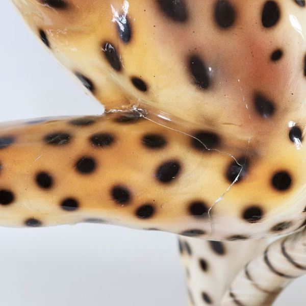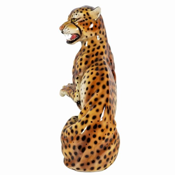 "Leopardo", scultura in ceramica porcellanata e smaltata a varie policromie, una zampa anteriore presenta rottura restaurata