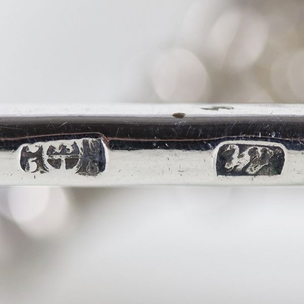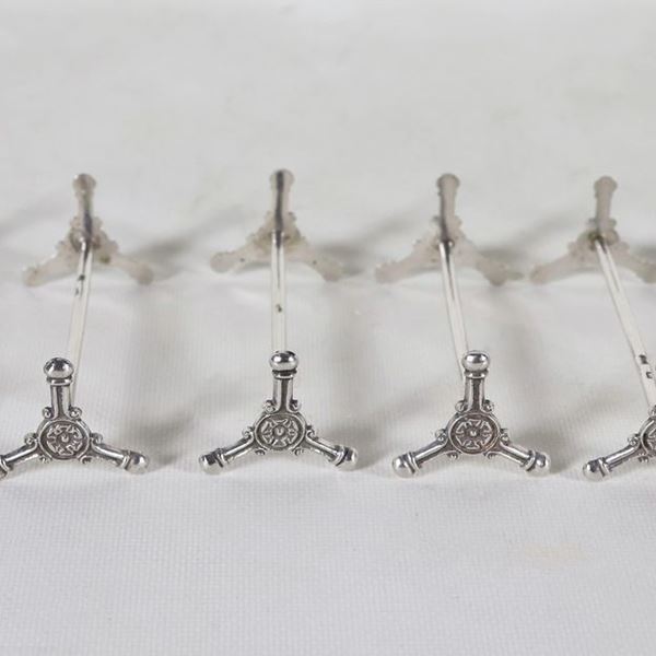 Lotto di dodici antichi poggia posate in argento cesellato e sbalzato, gr. 350