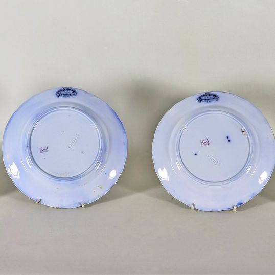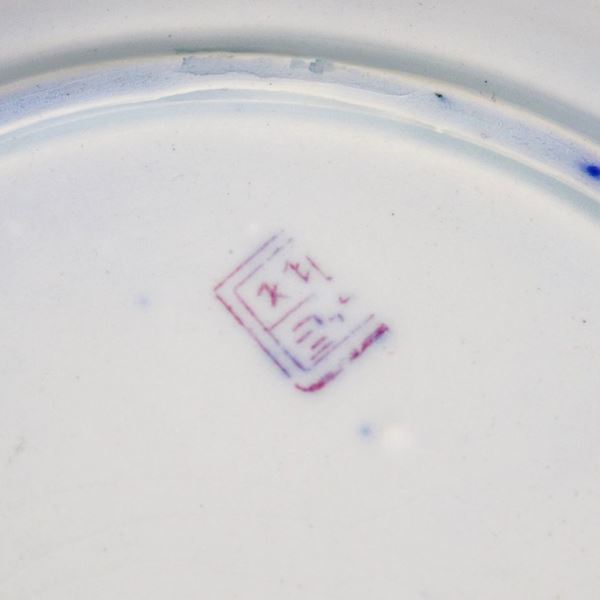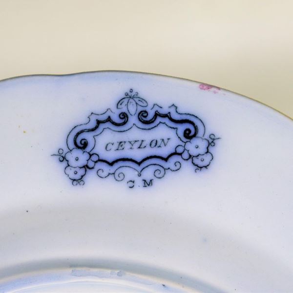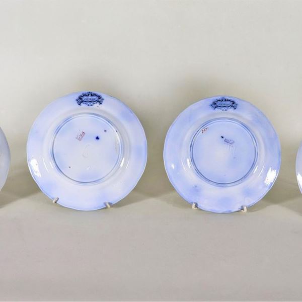 Lotto di otto antichi piatti inglesi in porcellana, con decorazioni variopinte a motivi floreali, quattro grandi e quattro piccoli
