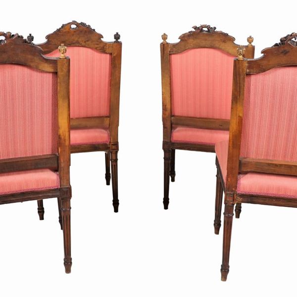Lotto di quattro antiche sedie francesi in noce, con schienali sagomati e intagliati a rilievo a motivi Luigi XVI di faretre e fiaccole, gambe [..]
