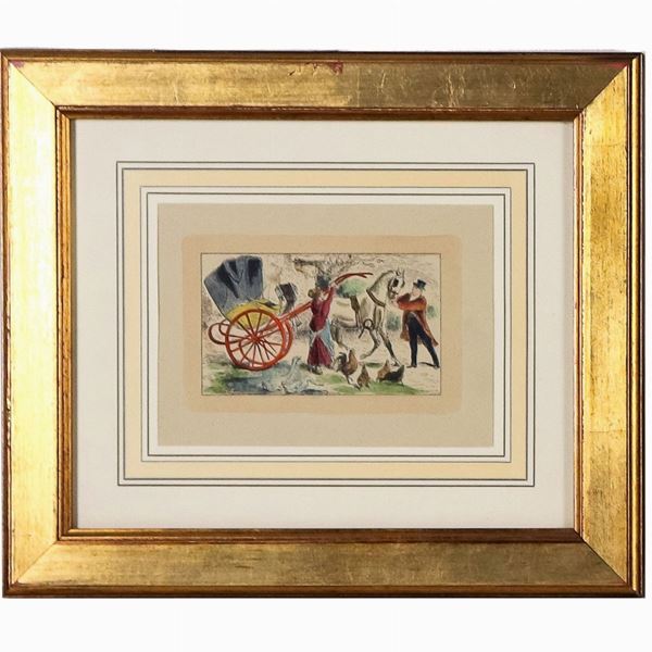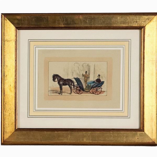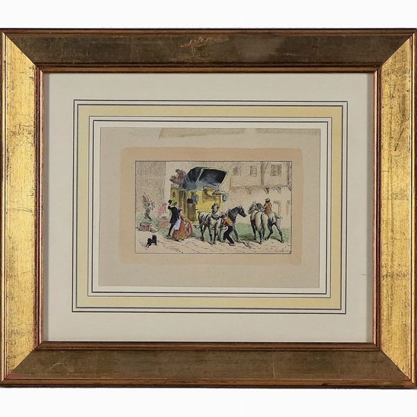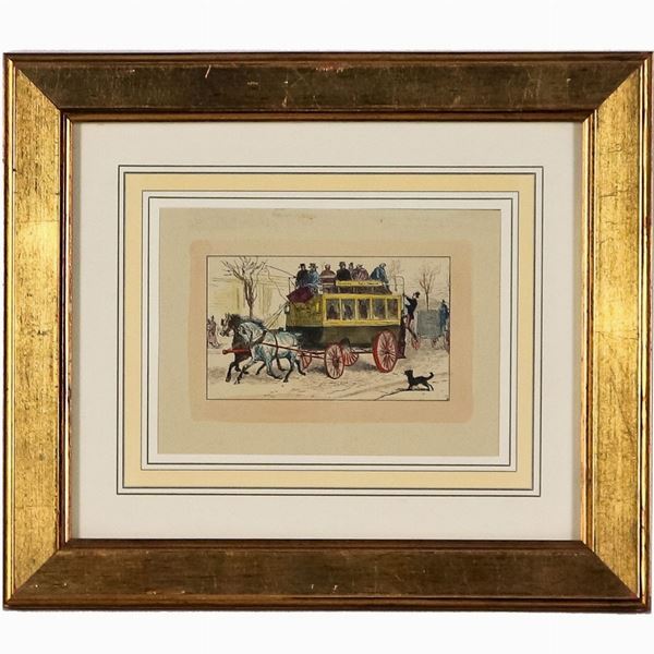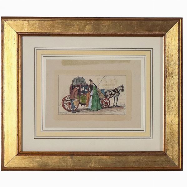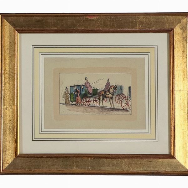 Lotto di sei piccole stampe a colori "Antiche carrozze con personaggi"