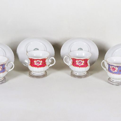 Lotto di sei tazze da tè con piattini in porcellana Royal China-Seltmann Bavaria, con decorazioni variopinte a motivi di medaglioni con fiori, [..]