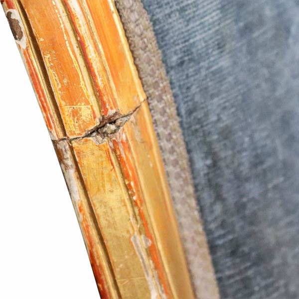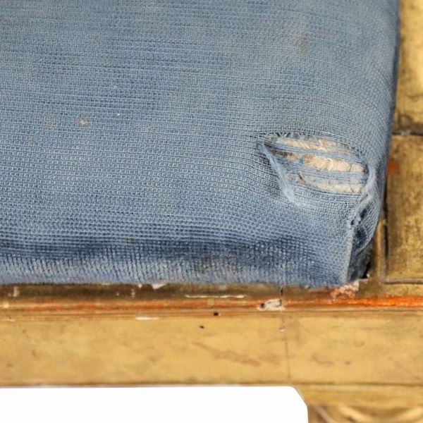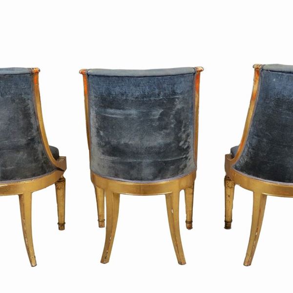 Lotto di tre antiche sedie di linea Impero in legno dorato, schienali a pozzetto