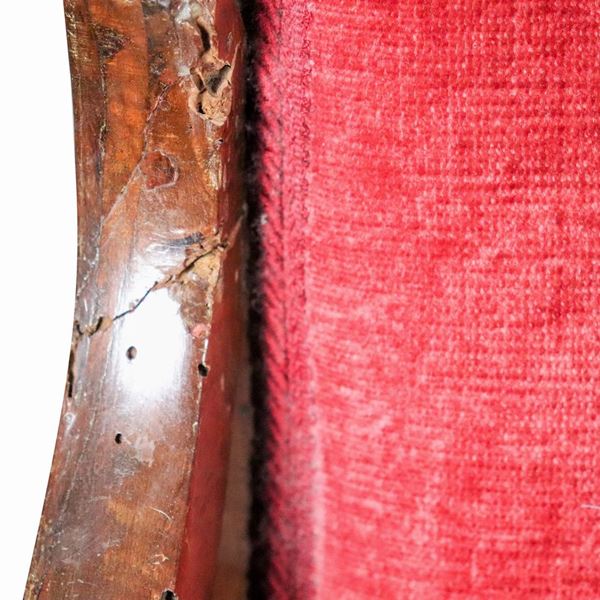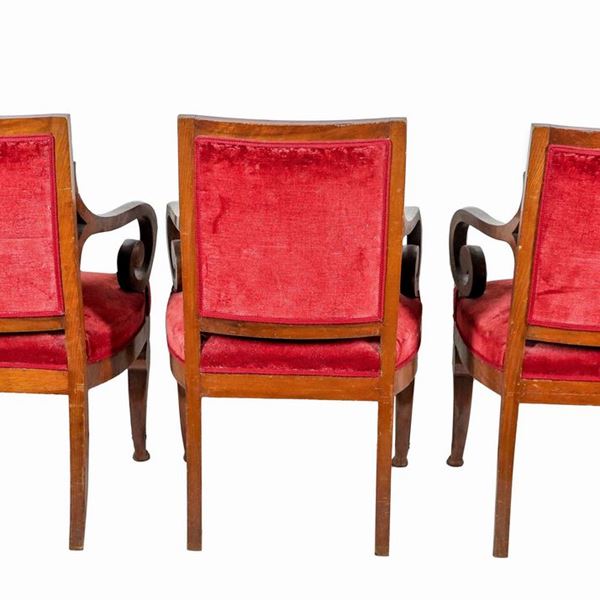 Lotto di tre poltrone Impero in noce, con braccioli ricurvi e gambe terminanti a zampa leonina, copertura in velluto rosso