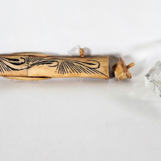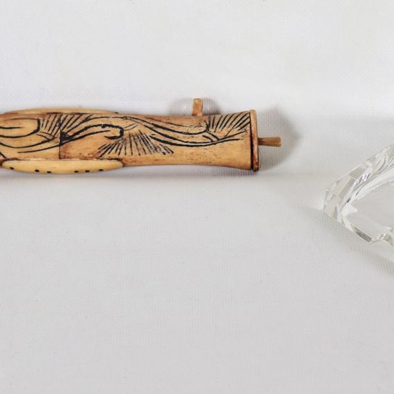 Lotto di un posacenere triangolare in cristallo e un porta dardi orientale in osso (2 pz)