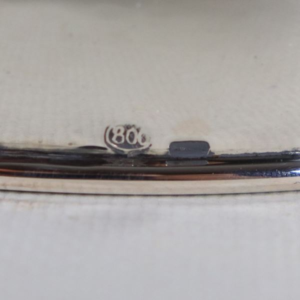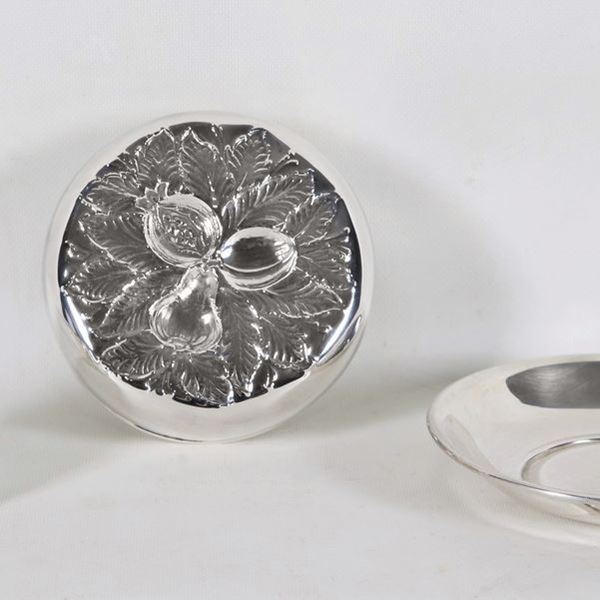 Lotto in argento di una coppetta assaggiavino, una ciotola tonda con grappolo d'uva sbalzato sul bordo e una ciotola tonda con bordo rialzato [..]