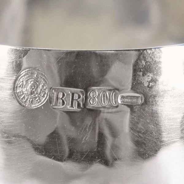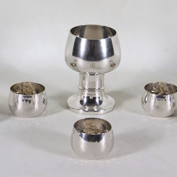 Lotto in argento liscio e martellato di una coppa e cinque bicchierini assaggiavino, gr. 420