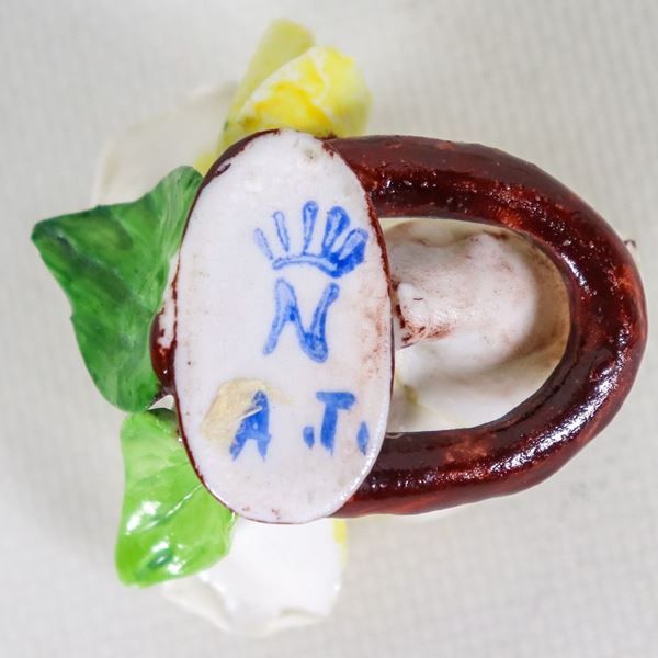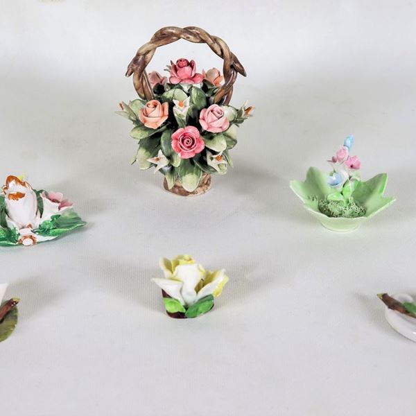 Lotto in porcellana policroma di Capodimonte di un piccolo cestino, un piccolo portacandele e quattro piccoli centrini a fiori (6 pz)