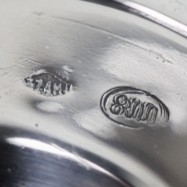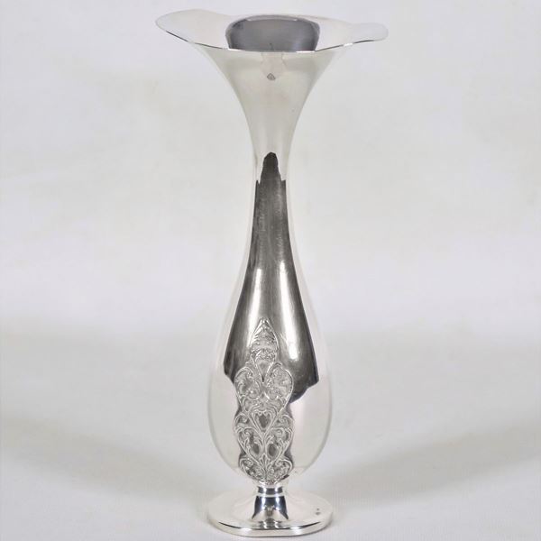 Piccola anfora in argento cesellato e sbalzato, lieve ammaccatura alla base, gr. 240