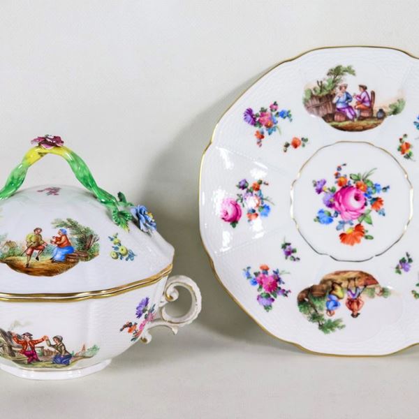Piccola zuppiera con piatto in porcellana tedesca di Dresden, con decorazioni variopinte a motivi di scene contadine e mazzetti di fiori