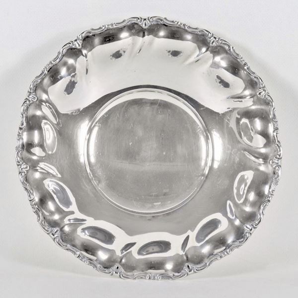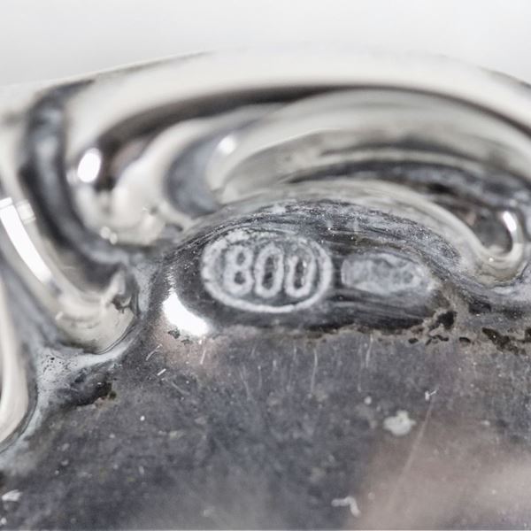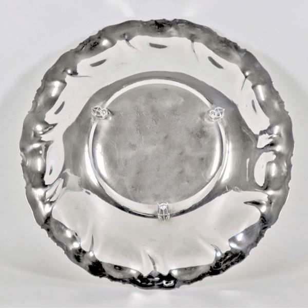 Piccolo centrotavola tondo in argento con bordo cesellato e sbalzato a volute, sorretto da tre piedini ricurvi, gr. 250