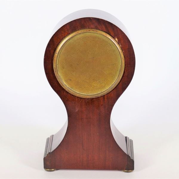 Piccolo orologio da tavolo in mogano con filettature intarsiate, quadrante in smalto bianco e meccanismo al quarzo