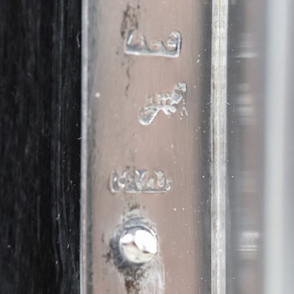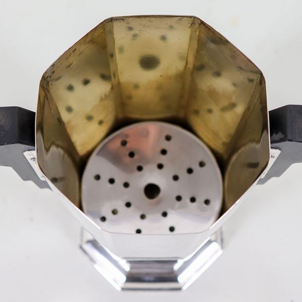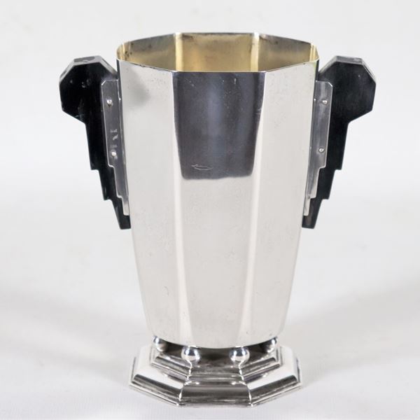Piccolo vaso Decò a forma ottagonale in metallo argentato con manici ebanizzati, sorretto da basetta con serie di sfere