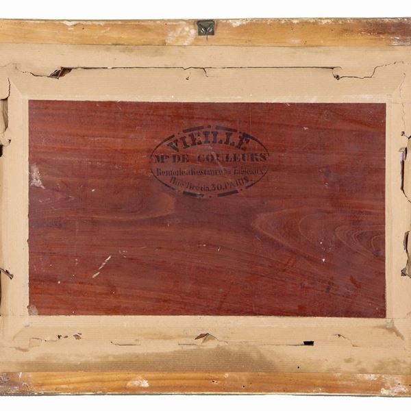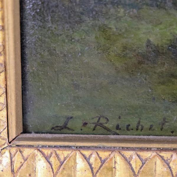 Firmato. "Paesaggio con fiume e pescatore", piccolo dipinto ad olio su tavoletta