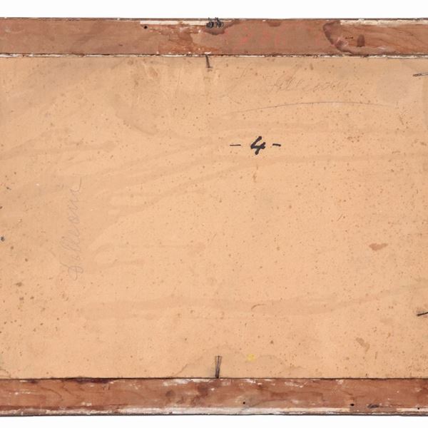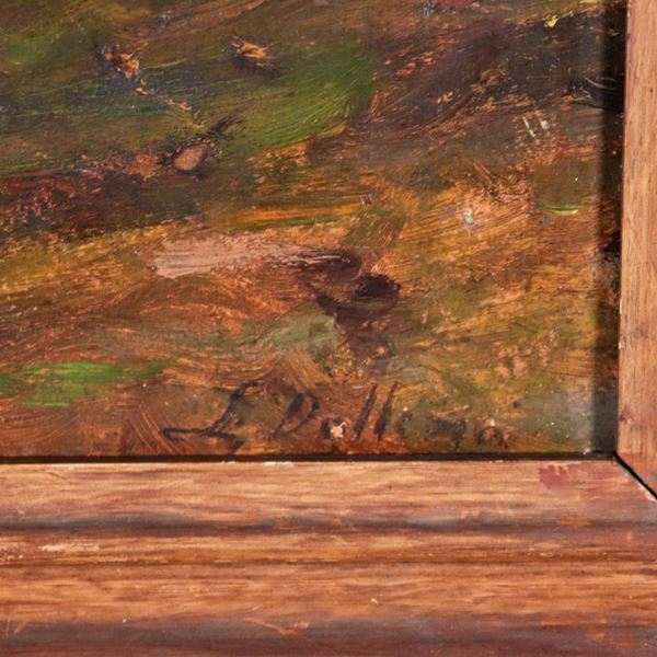 Tracce di firma. "Paesaggio montano con casolare", piccolo dipinto ad olio su cartone pressato