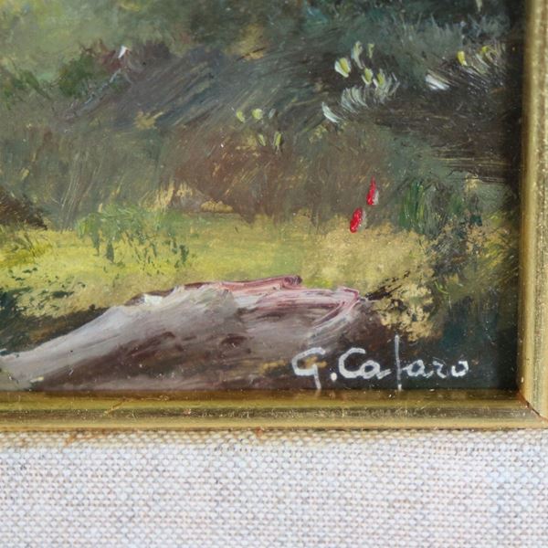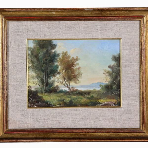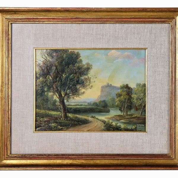 Firmati. "Paesaggi con laghi e castello", coppia di piccoli dipinti ad olio