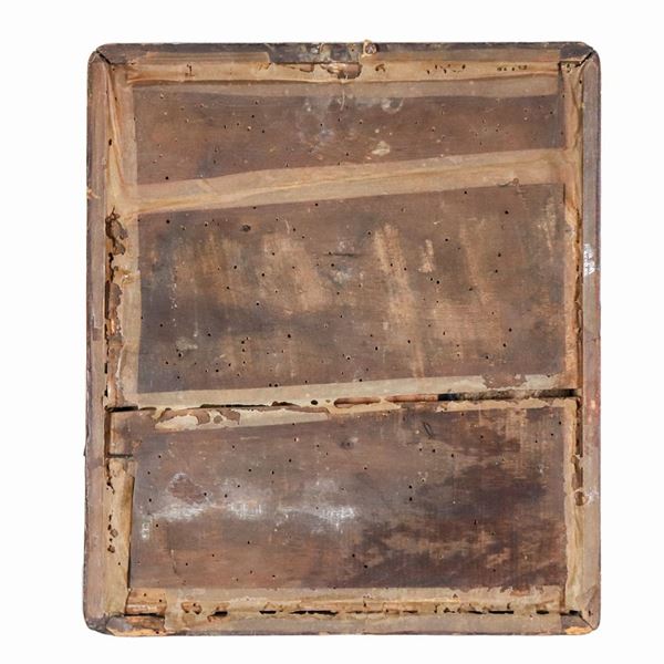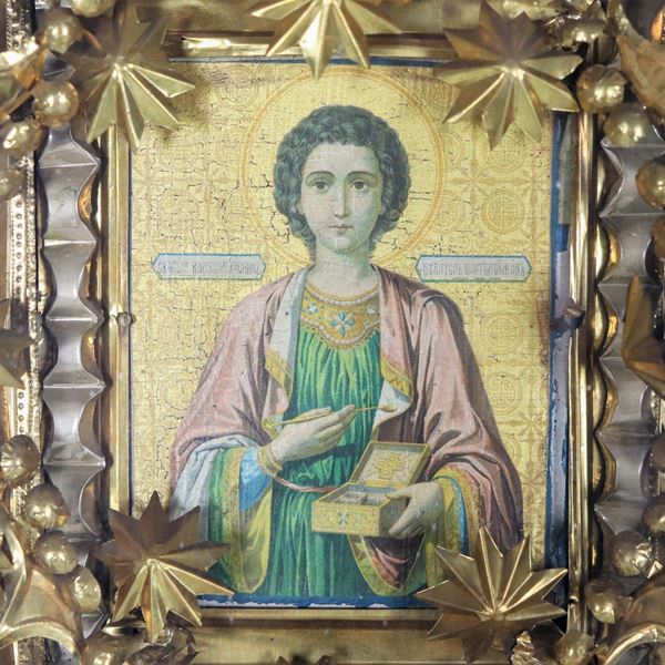 "San Pantaleimone", antica piccola icona da viaggio dipinta su tavoletta a fondo oro, racchiusa da cornice in rame dorato con intrecci floreali, [..]