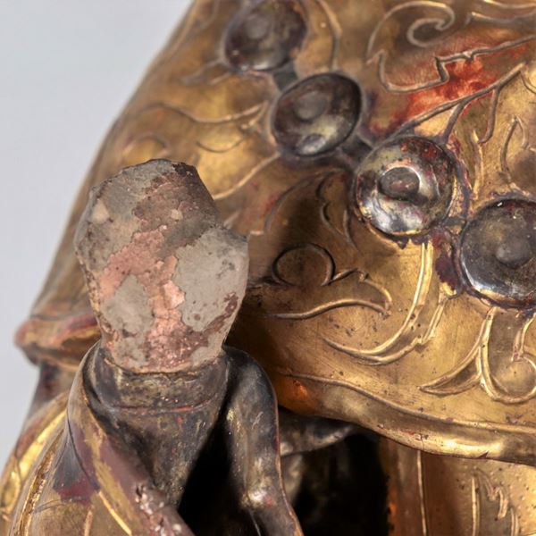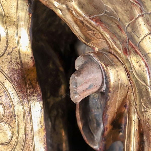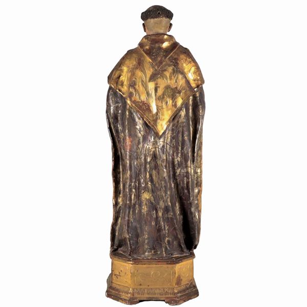 "Santo", antica scultura in legno policromo e dorato, mancante di parti delle mani