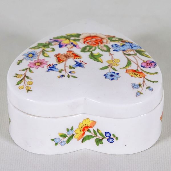 Scatola a forma di cuore in porcellana inglese Aynsley, con decorazioni smaltate a rilievo a motivi di fiori e farfalle
