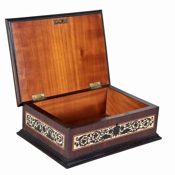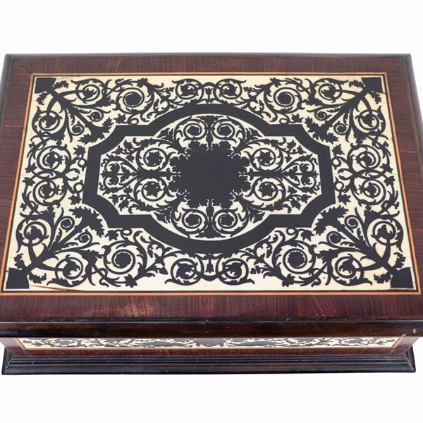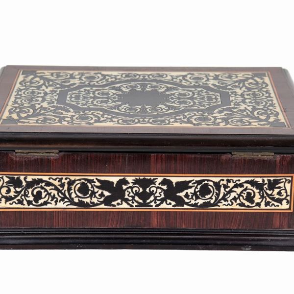Scatola rettangolare in palissandro, interamente intarsiata a motivi di volute floreali
