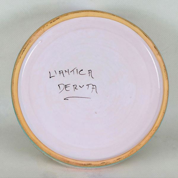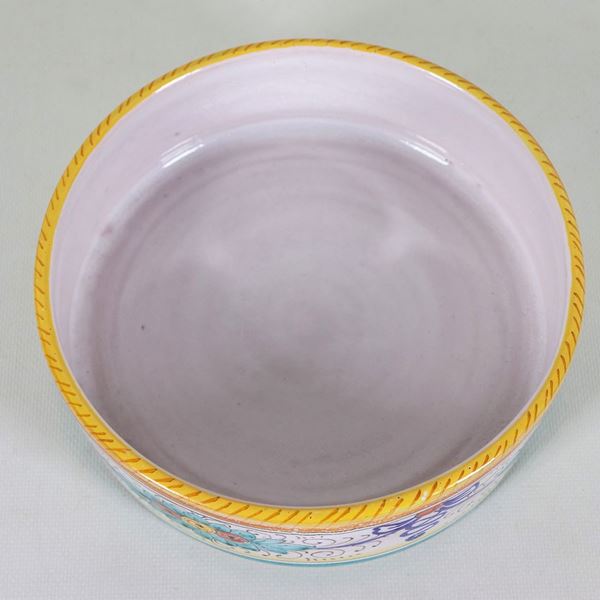 Scatola tonda in maiolica smaltata Deruta con decorazioni policrome a motivi di grifo e ghirlande di frutta