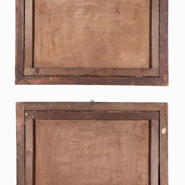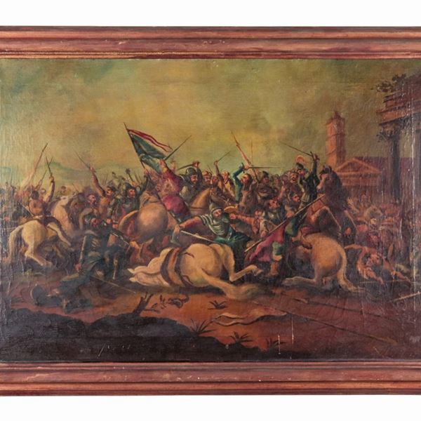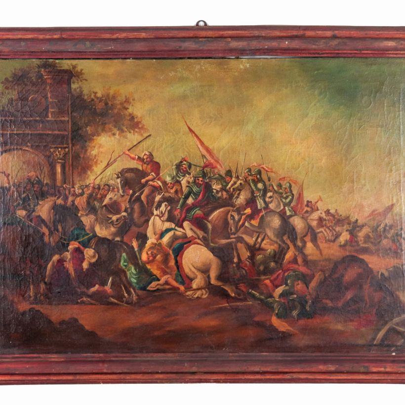 "Scene di battaglia", coppia di dipinti ad olio su tela