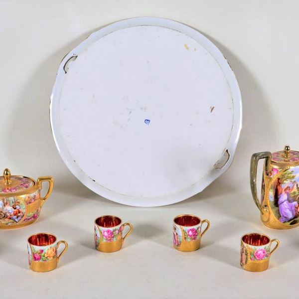 Servizio da caffè in porcellana Vienna-Rosenthal, interamente decorato e variopinto a motivi di medaglioni con scene mitologiche e ghirlande [..]