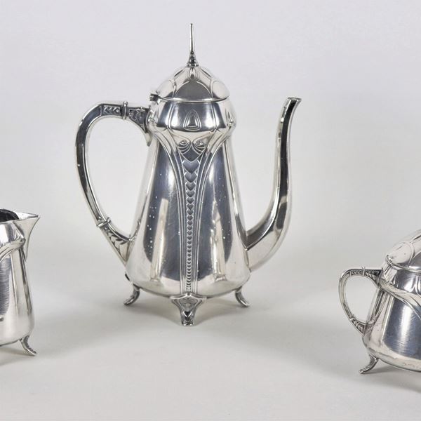 Servizio da caffè Liberty marcato W.M.F. in metallo argentato, sbalzato e cesellato (3 pz)