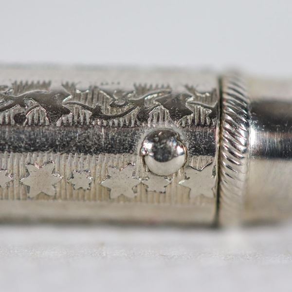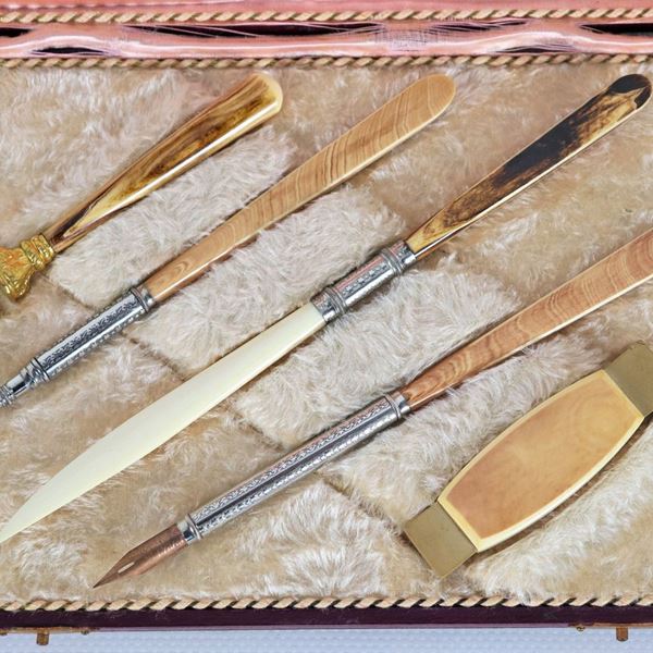 Servizio da scrittoio in argento e corno con astuccio in pelle rossa (5 pz)