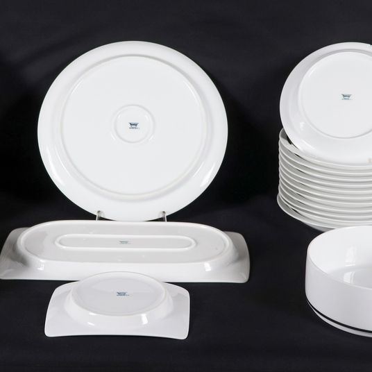Servizio di piatti in porcellana bianca tedesca con filettature argentate, (41 pz)