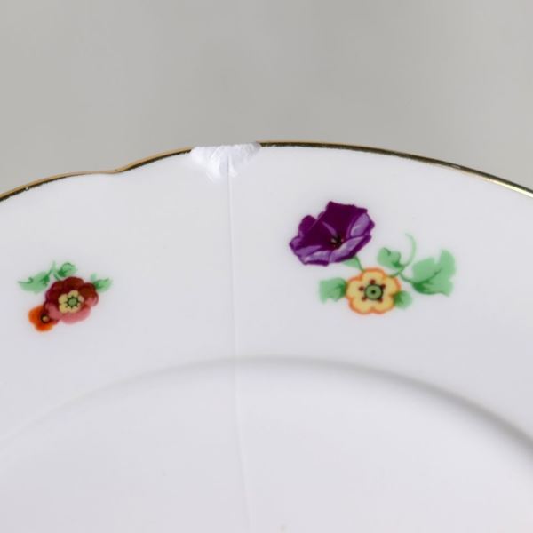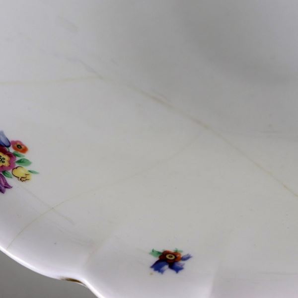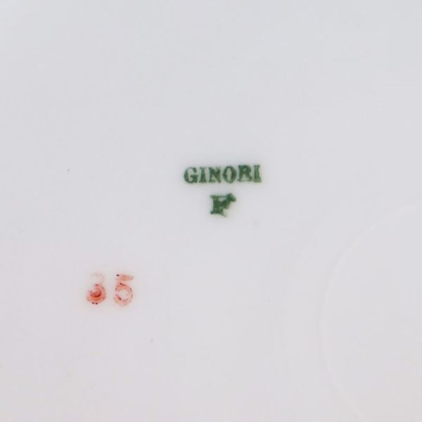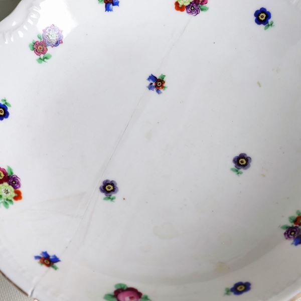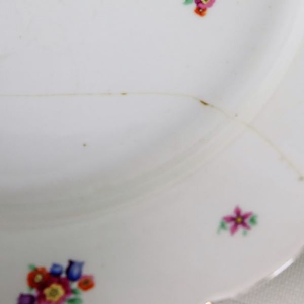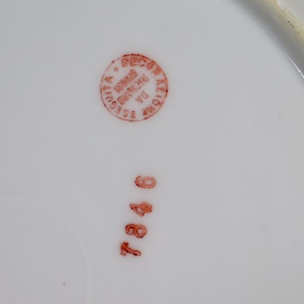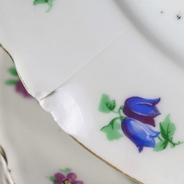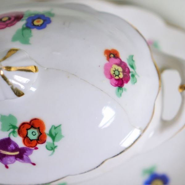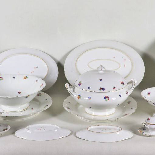 composto da: 11 fondine, 24 piatti piani, 10 piatti piccoli, 1 zuppiera, 1 insalatiera, 1 salsiera, 1 piccola cremiera, 2 burriere, 1 alzata per frutta, 2 piatti tondi e 2 ovali da portata. I piatti presentano varie sbeccature, l'alzata e la cremiera presentano rotture.