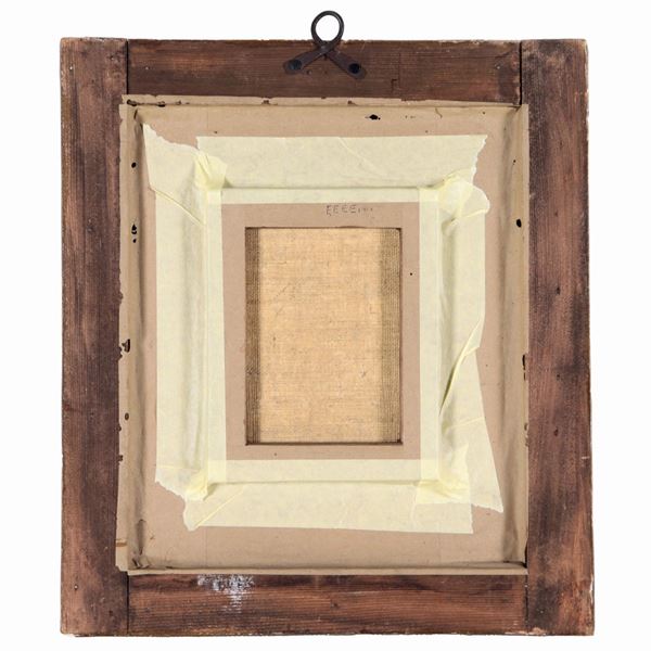 Firmato e datato 1840. "Veduta dei Fori con l'Arco di Settimio Severo e il Tempio di Saturno", piccolo dipinto ad olio su tela