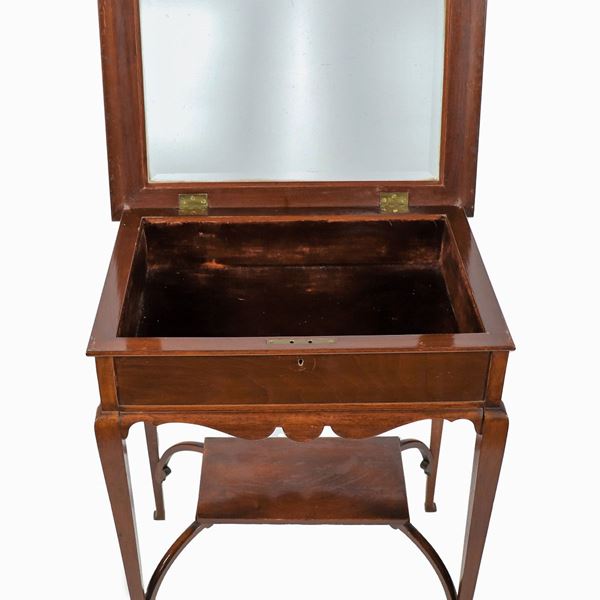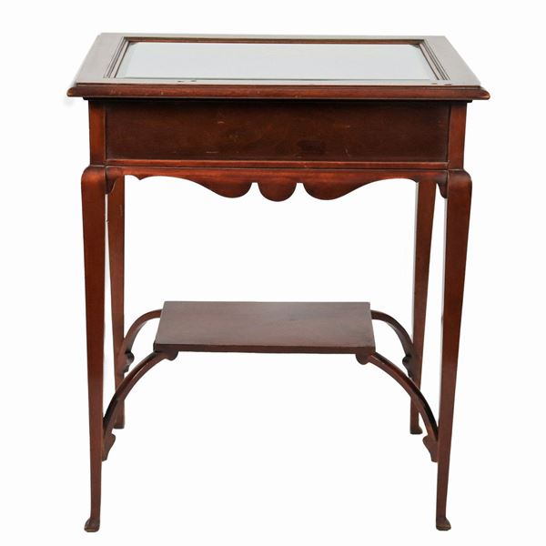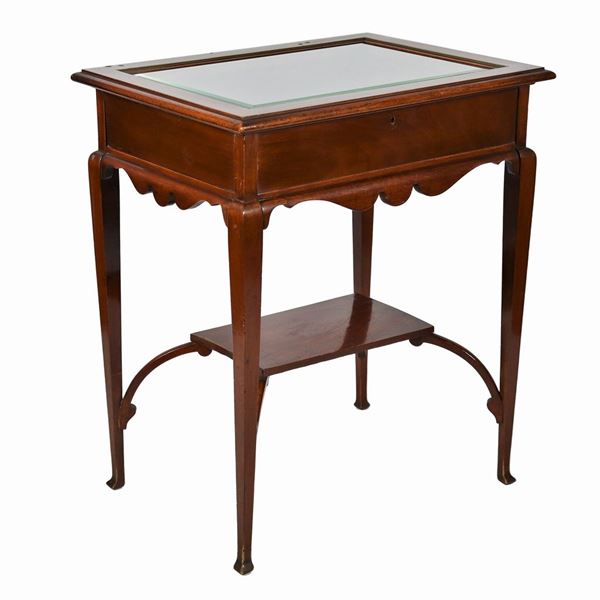 Tavolinetto inglese a vetrina in mogano con quattro gambe riunite da pianetto sottostante