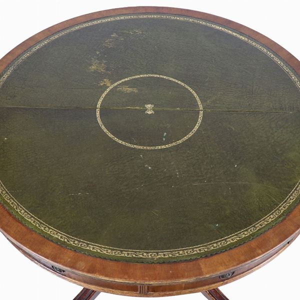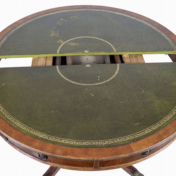 Tavolo inglese da biblioteca allungabile a forma tonda in mogano, piano in pelle verde con bordure dorate e base a quattro gambe a sciabola, [..]