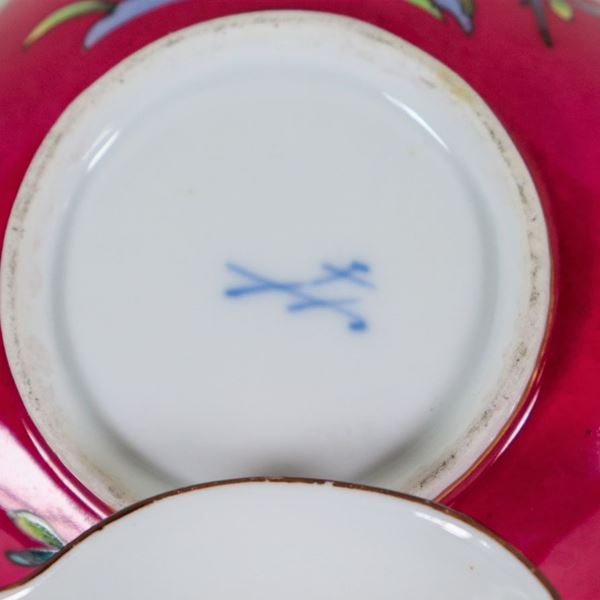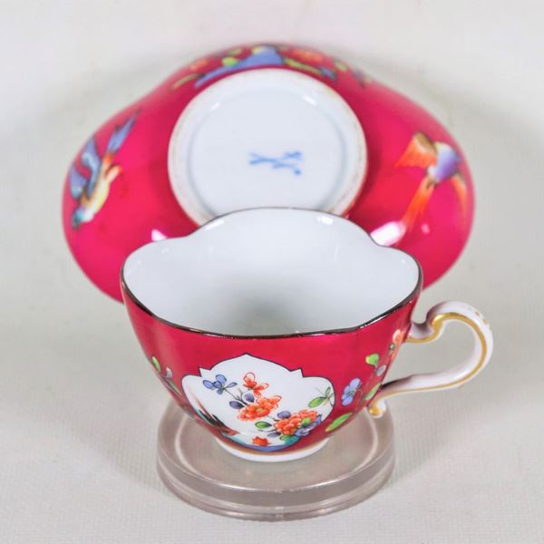 Tazza con piattino in porcellana Meissen, con decorazioni variopinte a motivi di fiori e uccelli