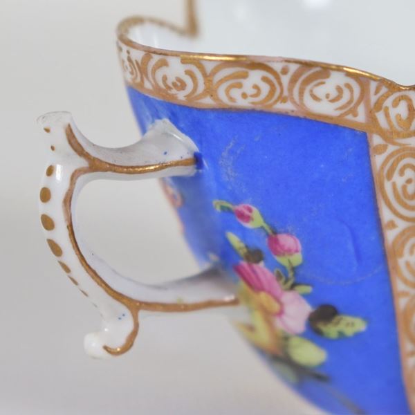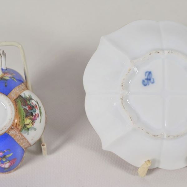 Tazza con piattino in porcellana tedesca bianca e blu, con decorazioni policrome di scene galanti e mazzetti di fiori, piccola mancanza al manico [..]