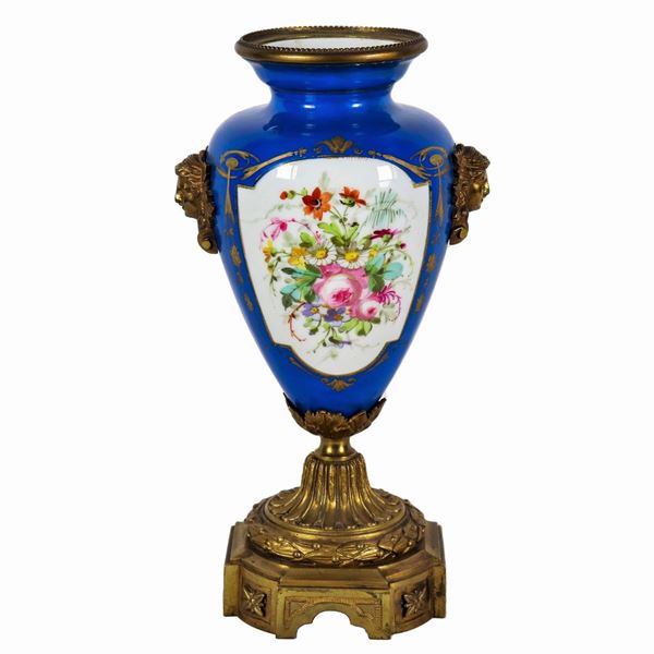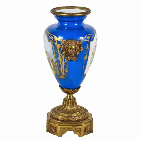 Vaso ad anfora in porcellana turchese di Sèvres, con medaglioni dipinti di scena pastorale e mazzetti di fiori, lumeggiature in oro zecchino, [..]