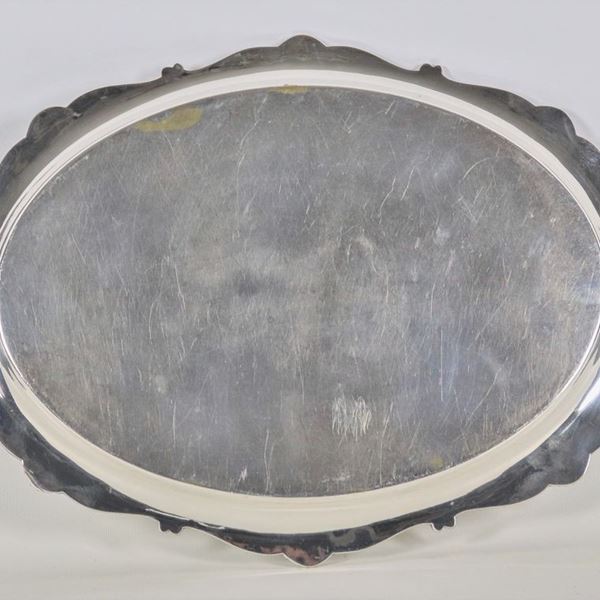 Vassoio ovale centinato in metallo argentato, con manici e bordi cesellati e sbalzati a motivi di volute e conchiglie