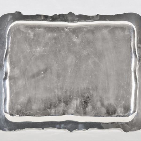 Vassoio rettangolare in metallo argentato, con manici e bordi cesellati e sbalzati a motivi di volute e ricci