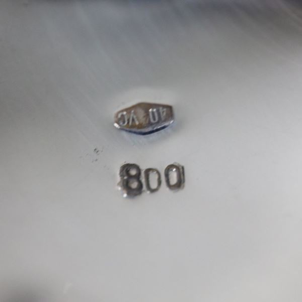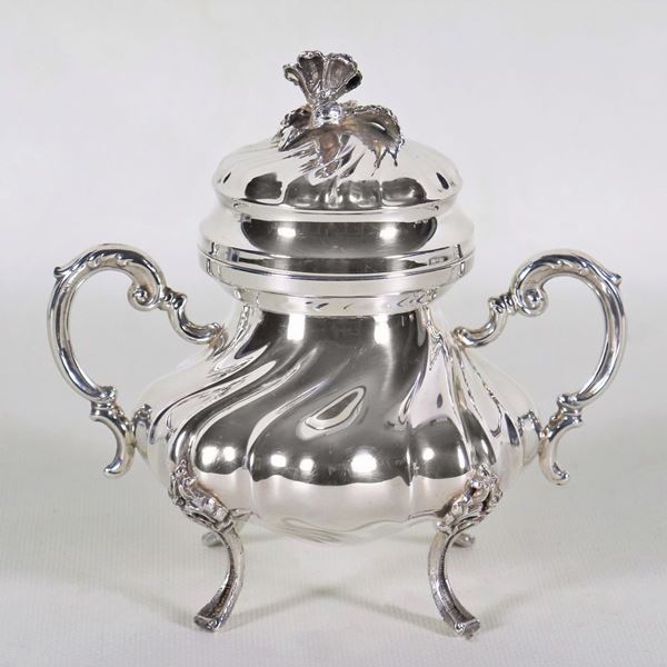 Zuccheriera in argento con due manici ricurvi, cesellata e sbalzata a motivi torchon e sorretta da quattro piedini ricurvi, gr. 200
