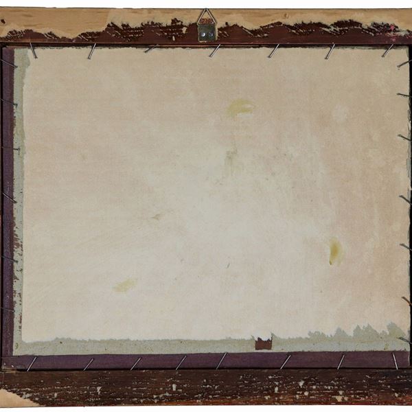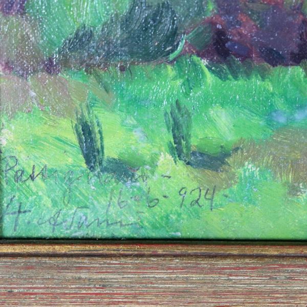 Firmato e datato 1924. "Veduta di Passignano sul Trasimeno", dipinto ad olio su tela applicata a cartone