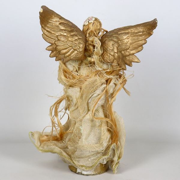"Angelo", piccola scultura in ceramica policroma con ali in legno dorato, difetti e lieve mancanza a una mano