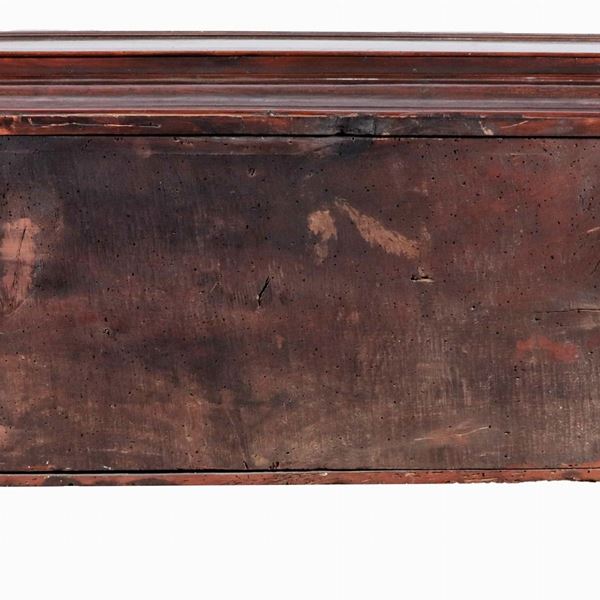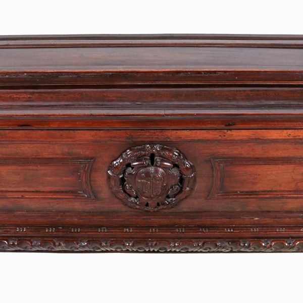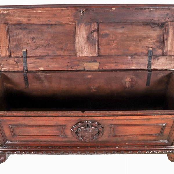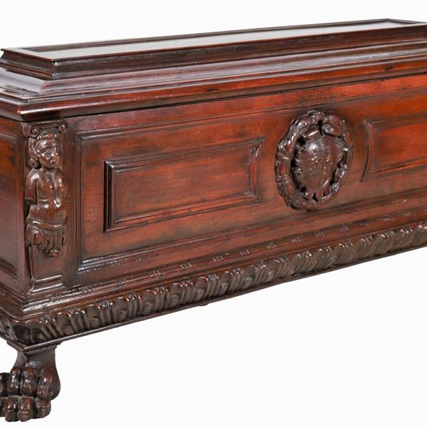 Antica cassapanca umbra in noce, con al centro stemma gentilizio intagliato e montanti con sculture di cariatidi, gambe a zampe leonine