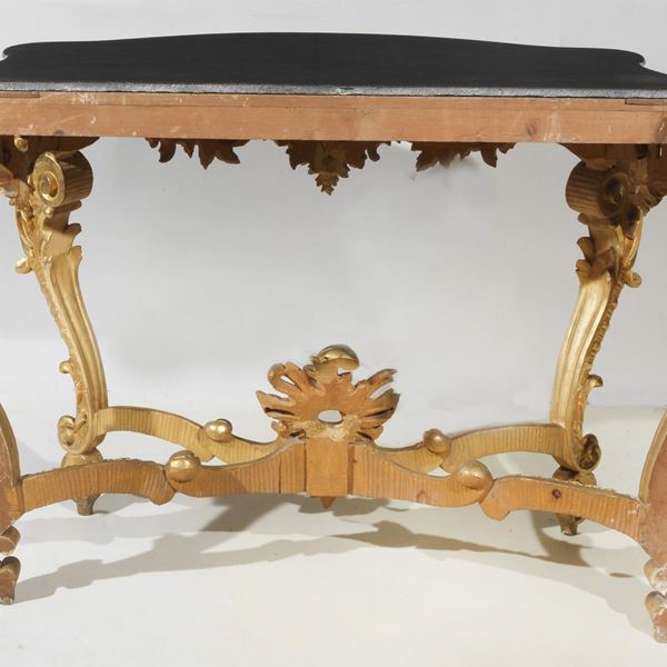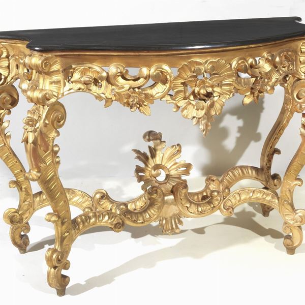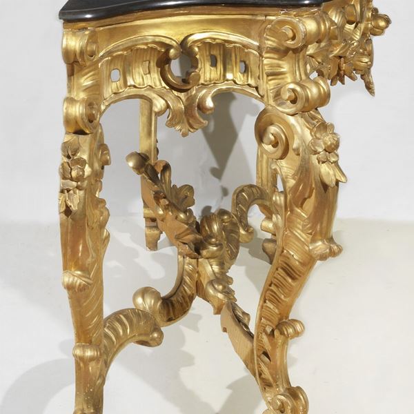 Antica consolle napoletana Luigi Filippo (1830-1848), in legno dorato e intagliato a motivi di foglie d'acanto, ricci e fiori, quattro gambe [..]