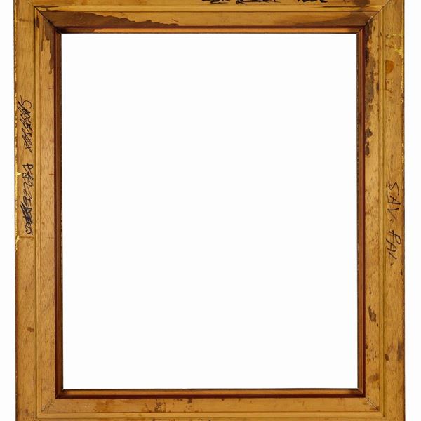 Antica cornice in legno patinato, dorato e intagliato a motivi vegetali