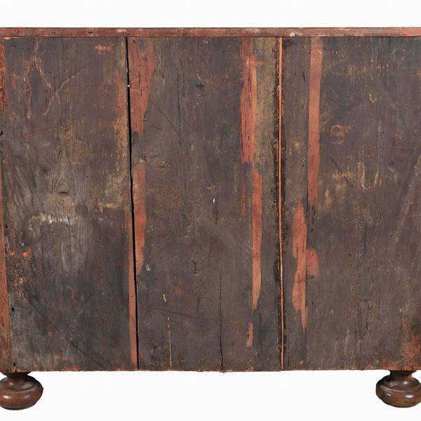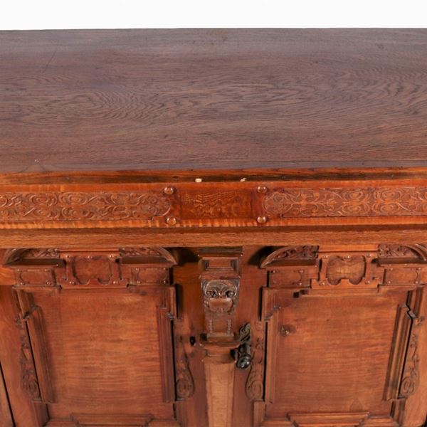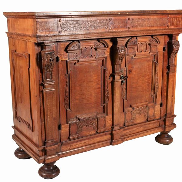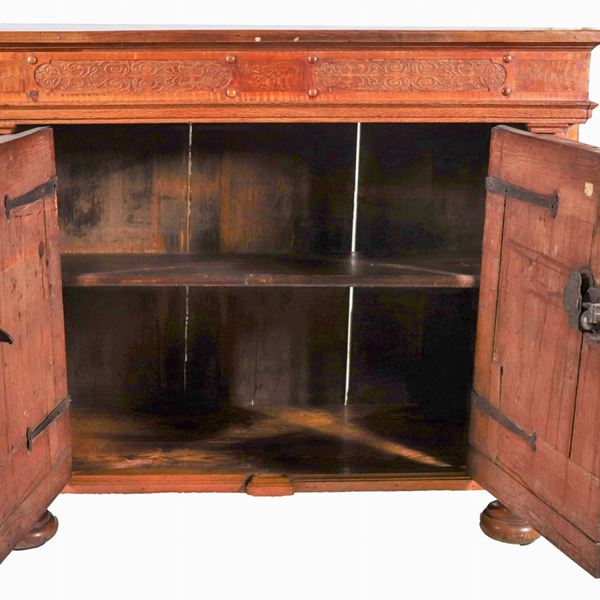 Antica credenza in legno chiaro con frontale intagliato, due sportelli e quattro gambe a cipolla