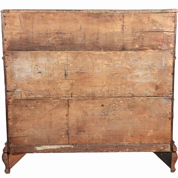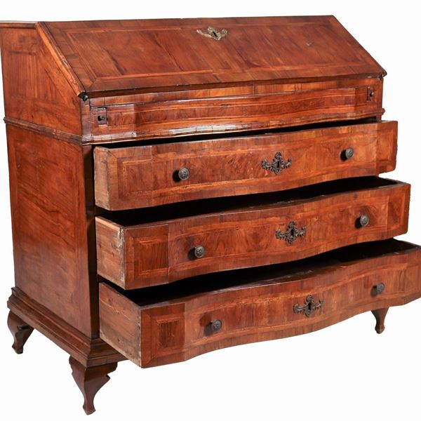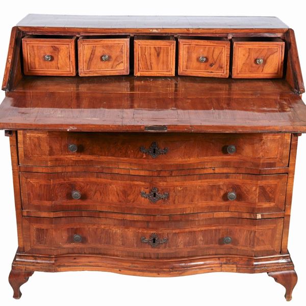 Antica ribalta ferrarese Luigi XV in noce e radica di noce, con intarsi a riquadri geometrici, calatoia formante scrittoio con cinque piccoli [..]