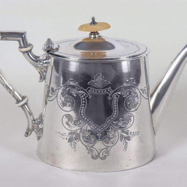 Antica teiera inglese Vittoriana in sheffield, cesellata e sbalzata a motivi floreali e scudi. Lievi difetti