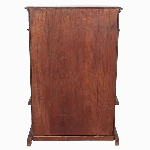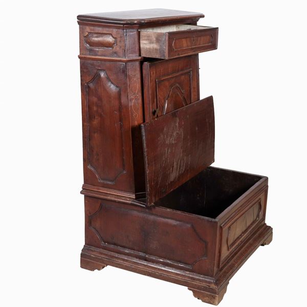 Antico inginocchino veneto in noce, con bugnature e filettature intarsiate in bosso, un tiretto centrale con sportello sottostante e predellino [..]