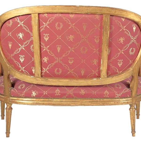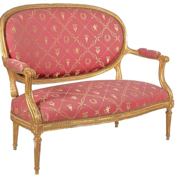Antico piccolo divano francese di linea Luigi XVI, in legno dorato e intagliato a motivi neoclassici, copertura in tessuto rosso porpora a disegni [..]